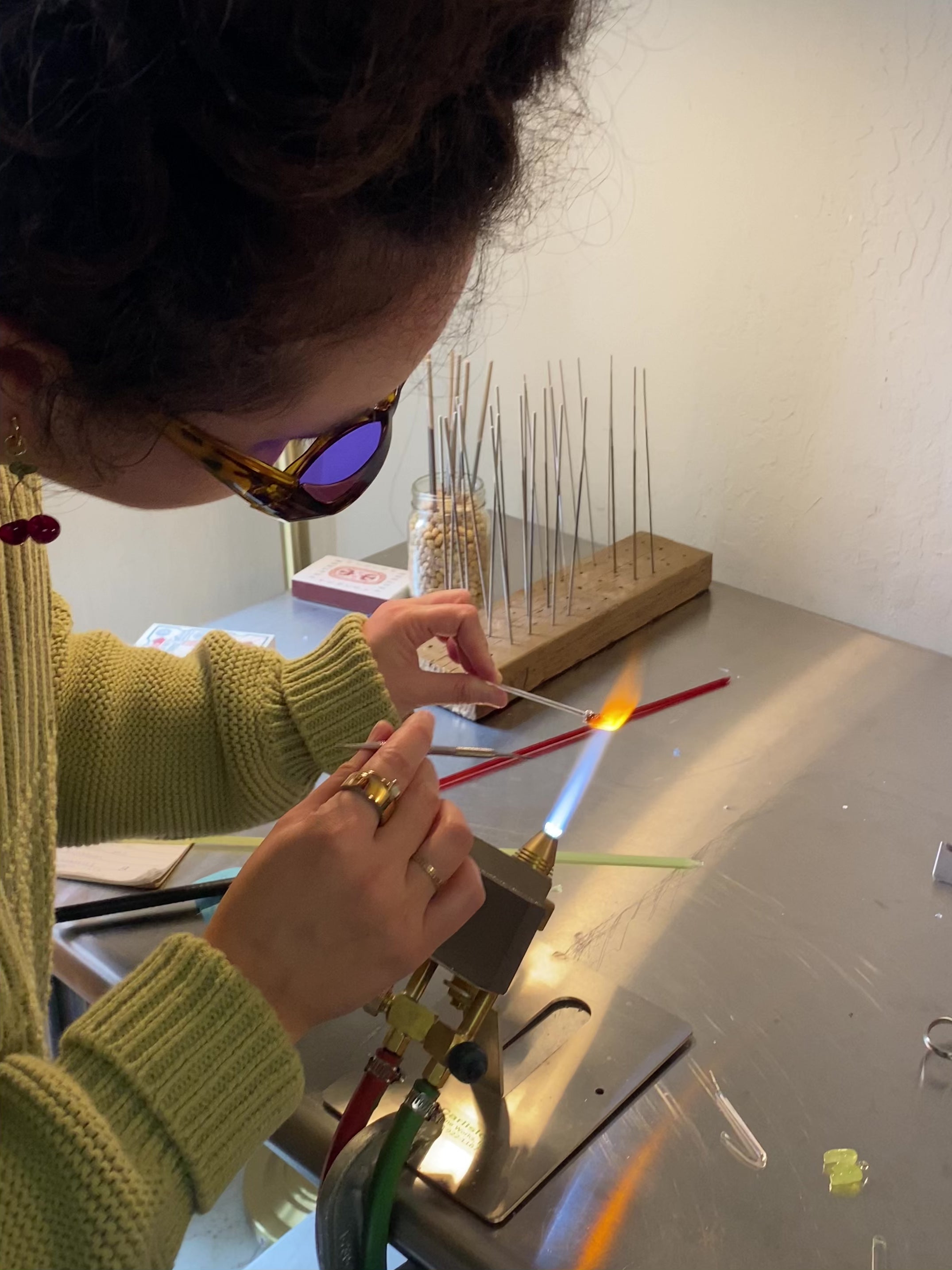 Each glass bead is delicately sculpted in the flame, annealed to ensure longevity, adorned on 18K gold filled settings and packaged in sustainable packaging - always aiming to contribute as little waste as possible.